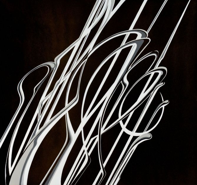 Lisa Stefanelli (American, born 1966) is a painter known for her work in hardline, linear abstraction. Her “Melee” series (1998-2015) is associated with her formative years as a competitive figure skater. Made with automotive paint on panel and drawing on a multitude of visual references, the paintings represent a conversation about the artist’s view of our relationships. They display both grace and complexity in their entanglements, trajectories, and occasional estrangements, and attempt to resolve the struggle that they depict and embody. In the 2010s, Stefanelli began a digital practice centered around concepts from the natural world. This work suggests that all human actions have natural origins.