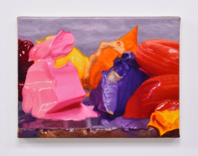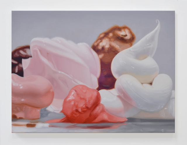 By photographing paint and luxurious ephemera at close range, then using the resulting image as his subject, Ben Weiner creates works that pose a confusion of object, subject and medium. Weiner’s paintings harness the idolatrous fetishistic desire of consumer culture, the fashion industry, and the art world. Thus, his paintings self-critically describe the duality of their own identity as both transcendent creation and commercial item. Likewise, all of the themes and references in the paintings reinforce their status as consumer/art objects. Roland Bathes’ application of Freud’s concept of “the uncanny” to landscape photography is the pertinent reference.