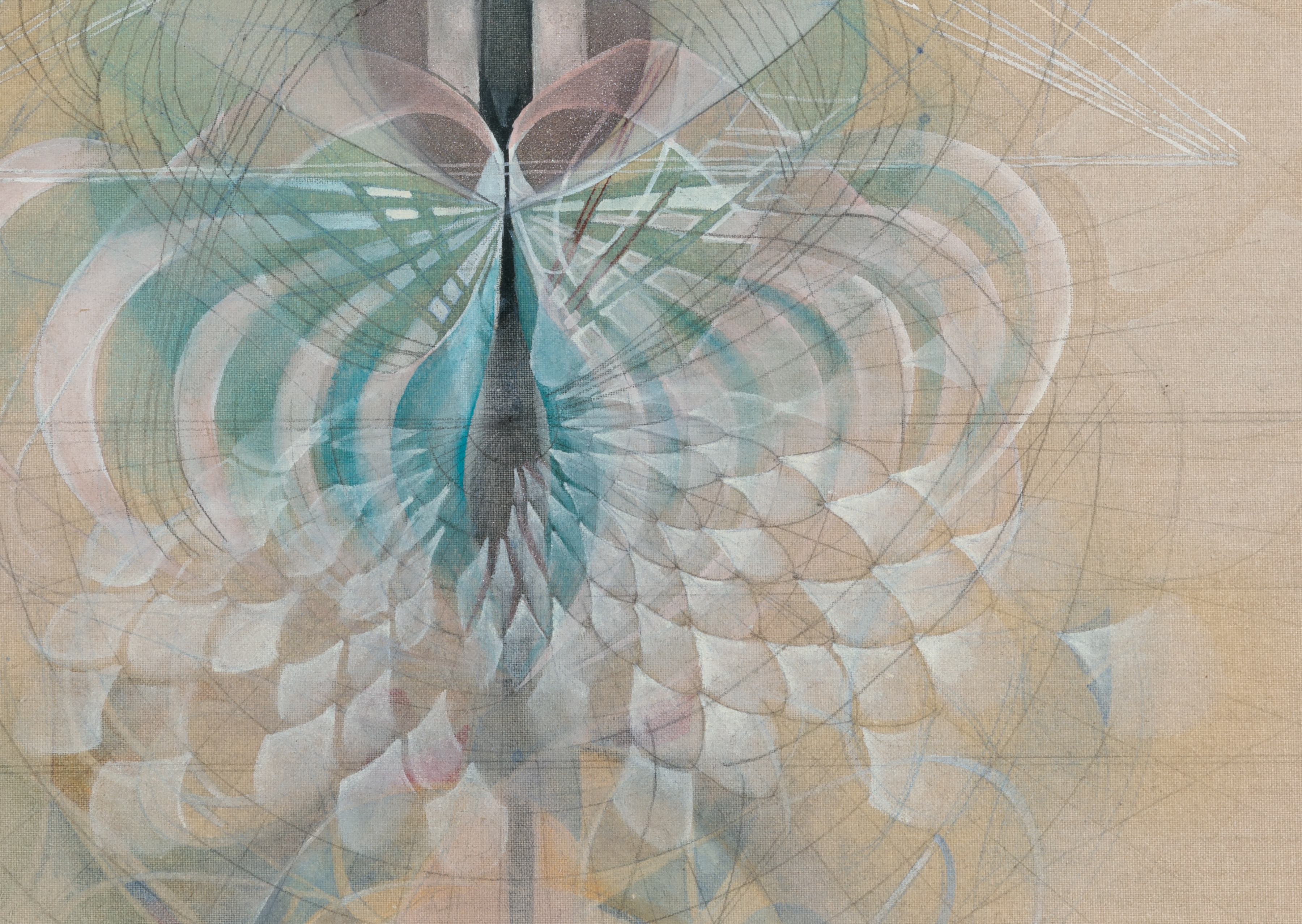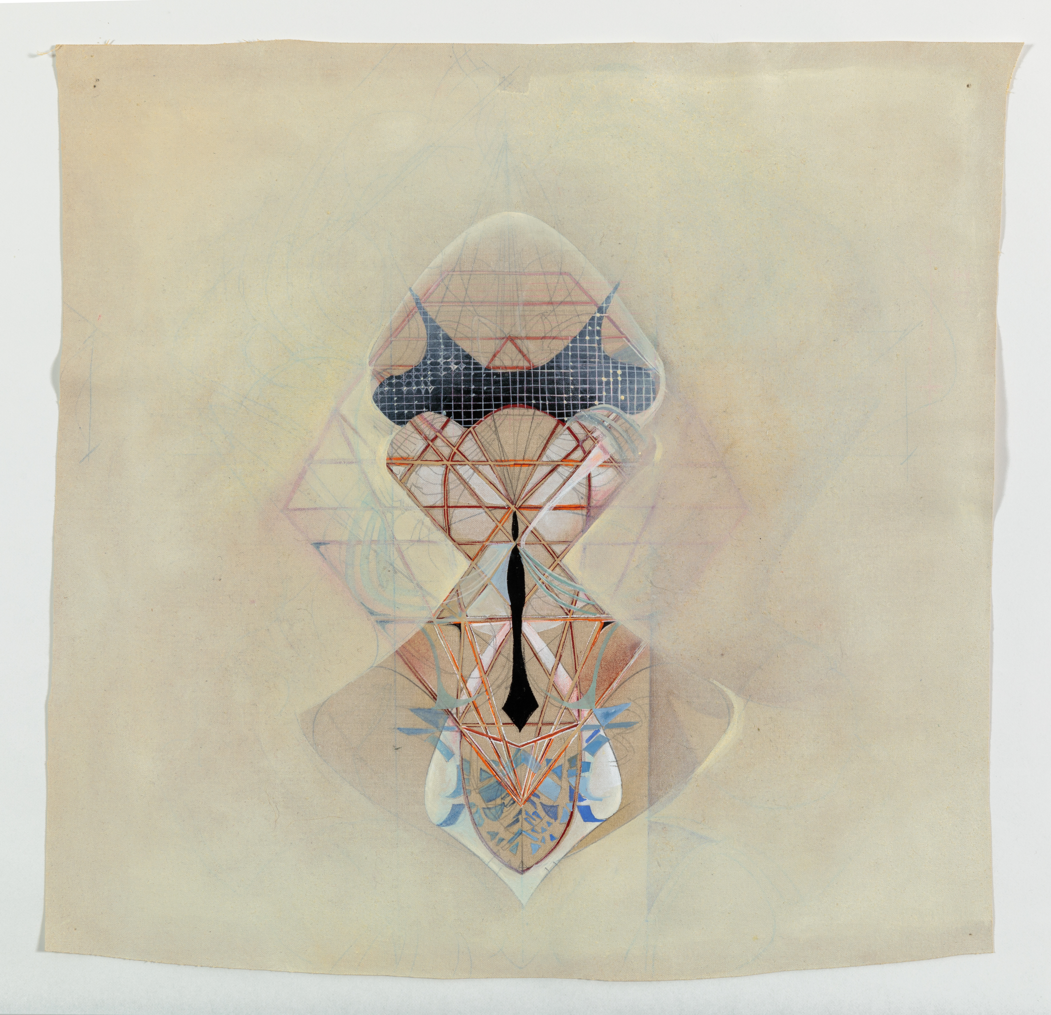 Myers’ compositions, always balanced but never exactly symmetrical, seamlessly integrate layers of matter radiating from a central, often labial core. Some elements are comprised of soft, biomorphic forms, at times fleshy and pulsating, at other times wispy and iridescent. Other structures appear as webs of severe, geometric forms slicing through the multi-layered composition, reminiscent of cyborgian hybrids, industrial machinery, and the bio-mechanical art of H. R. Giger. Many elements of Myers’ works are reminiscent of human organs, particularly the vulva, a symbol of creation that relates to the cyclical recreation and renewal inherent to the mechanics of the universe. Myers’ art has clear ties to Feminist art, with notable visual similarities to Georgia O’Keeffe’s paintings of flowers, buildings, and landscapes, and Judy Chicago’s series of vulvic plates for “The Dinner Party.”