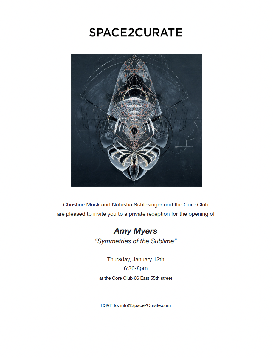 AMY MYERS Symmetries of the Sublime at Core Clubin NYC. Core Club is normally an exclusive members-only club, but you will have access to the show through the invitation I’ve included above. I hope you are able to join Amy Myers at the opening (list Thursday, January 12th, 6:30 – 8 PM) please RSVP using the email in the invitation above.