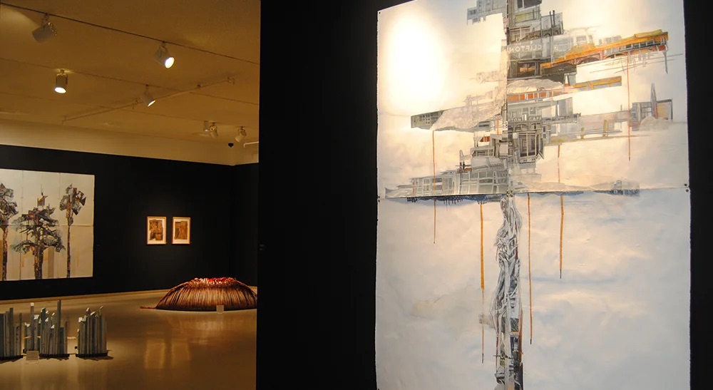 “In her mixed media collages, Gunlock explores the restless intersection of nature and the built environment. She depicts trees with rugged branches and burly roots wrangling with residential facades, windows, gates and other architectural features. Gunlock captures a fleeting moment in this struggle, one in which nature and architecture seem to co-exist in a colorful equilibrium, if only for a moment. Gunlock alludes to historical patterns of overshoot, which are marked by excessive demand for natural resources, followed by eras of human decline and the slow recovery of forests and ecosystems. But in these works, Gunlock offers a vision of a hopeful future in which the built environment is woven sustainably into the natural world.”