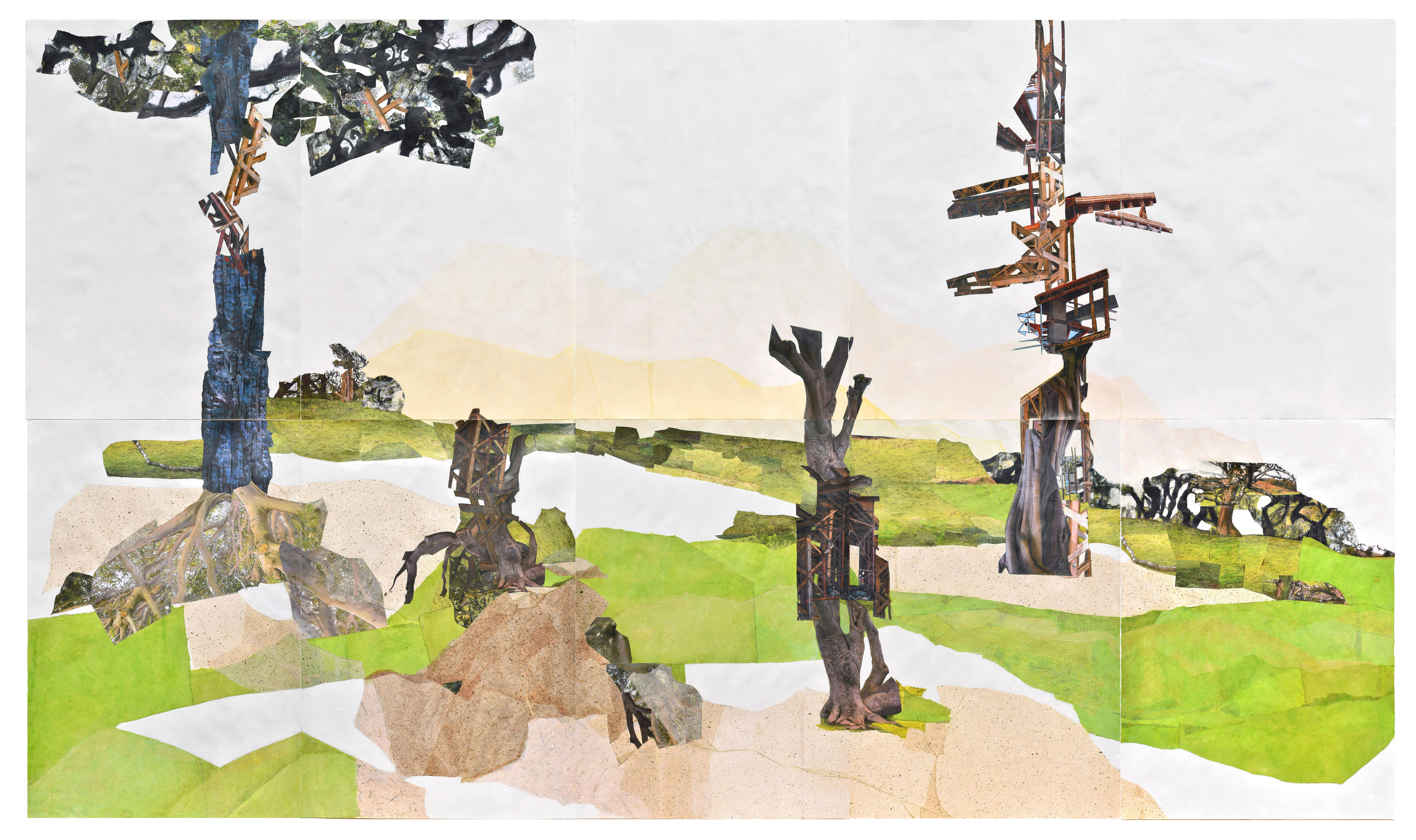 Jennifer Gunlock’s work explores the relationships between the objects of nature and those imposed upon them by human activity. By layering photographs taken on her travels, decorative papers and drawing, she constructs tree-based forms which are awkwardly fused with architectural motifs. Each composition reflects a long passage of time in which buildings and trees stretch and crumble, each pushing against the other. The work is a commentary on humanity’s direct impact on the environment, as well as Earth’s interminable shapeshifting over the long history of its existence.