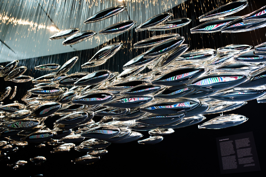 School isan international traveling exhibition, conceptualized and spearheaded by artist Joseph Rossano that casts light on the diminished state of global salmon and steelhead populations. The installation features a life-size school of mirrored salmon-like forms, sculpted from molten glass by concerned glassmakers from around the world, as well as first-hand video accounts from scientists, artists, and indigenous peoples.