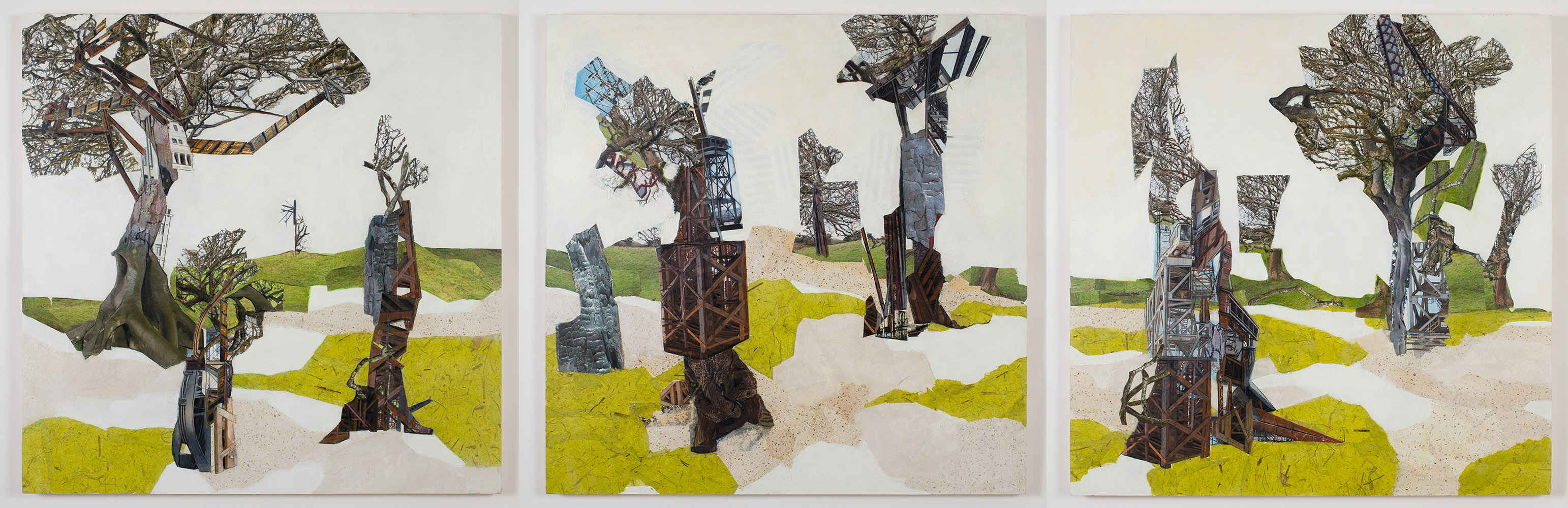 Jennifer Gunlock‘s work explores the relationships between the objects of nature and those imposed upon them by human activity. By layering photographs taken on her travels, decorative papers and drawing, she constructs tree-based forms which are awkwardly fused with architectural motifs. Each composition reflects a long passage of time in which buildings and trees stretch and crumble, each pushing against the other. The work is a commentary on humanity’s direct impact on the environment, as well as Earth’s interminable shapeshifting over the long history of its existence.