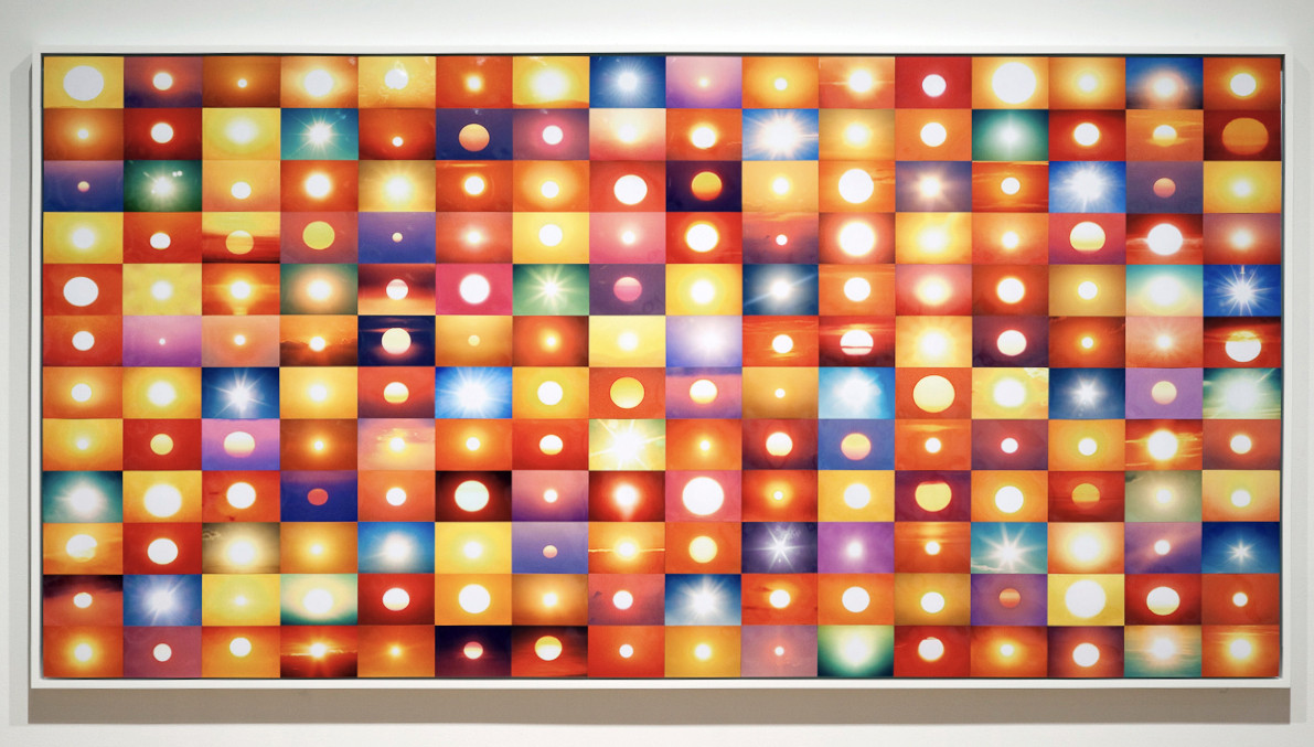 From site-specific performances to experimental process-based pieces, the depictions in “Captured Earth” showcase the various ways artists connect with and express the significance of the natural world. For example, Tarrah Krajnak documents her nature-centered rituals using rocks and plant materials, while Alan Cohen shares his meditative walks through landscapes. Jeremy Bolen develops photographs from film submerged in a polluted river, and Barbara Crane captures the bark of trees at her Michigan cabin retreat. Penelope Umbrico’s “8,146,774 Suns From Flickr (Partial) 9/10/10” (above) assembles thousands of photos of sunsets found on a photo sharing website, highlighting humanity’s universal fascination with the sun.
