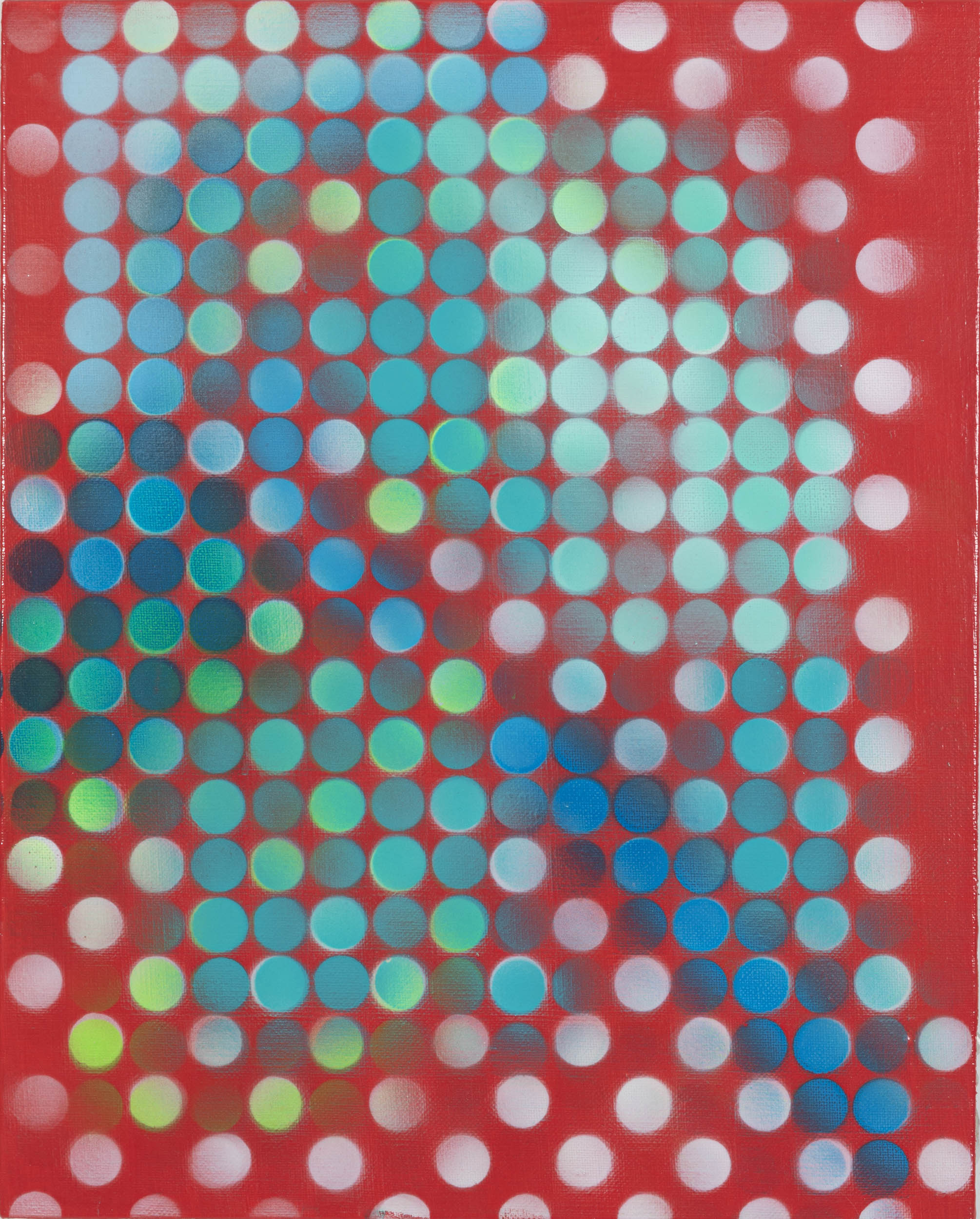 Made by layering clear acrylic over airbrushed patterns, these small, soft-edged, shaped paintings have surfaces with real depth—cracks and imperfections are sealed into the work, leaving visible “scars” that reveal their handmade origins. Blau’s focus on materiality and sculptural presence aligns her with artists like Kelly and Frank Stella.