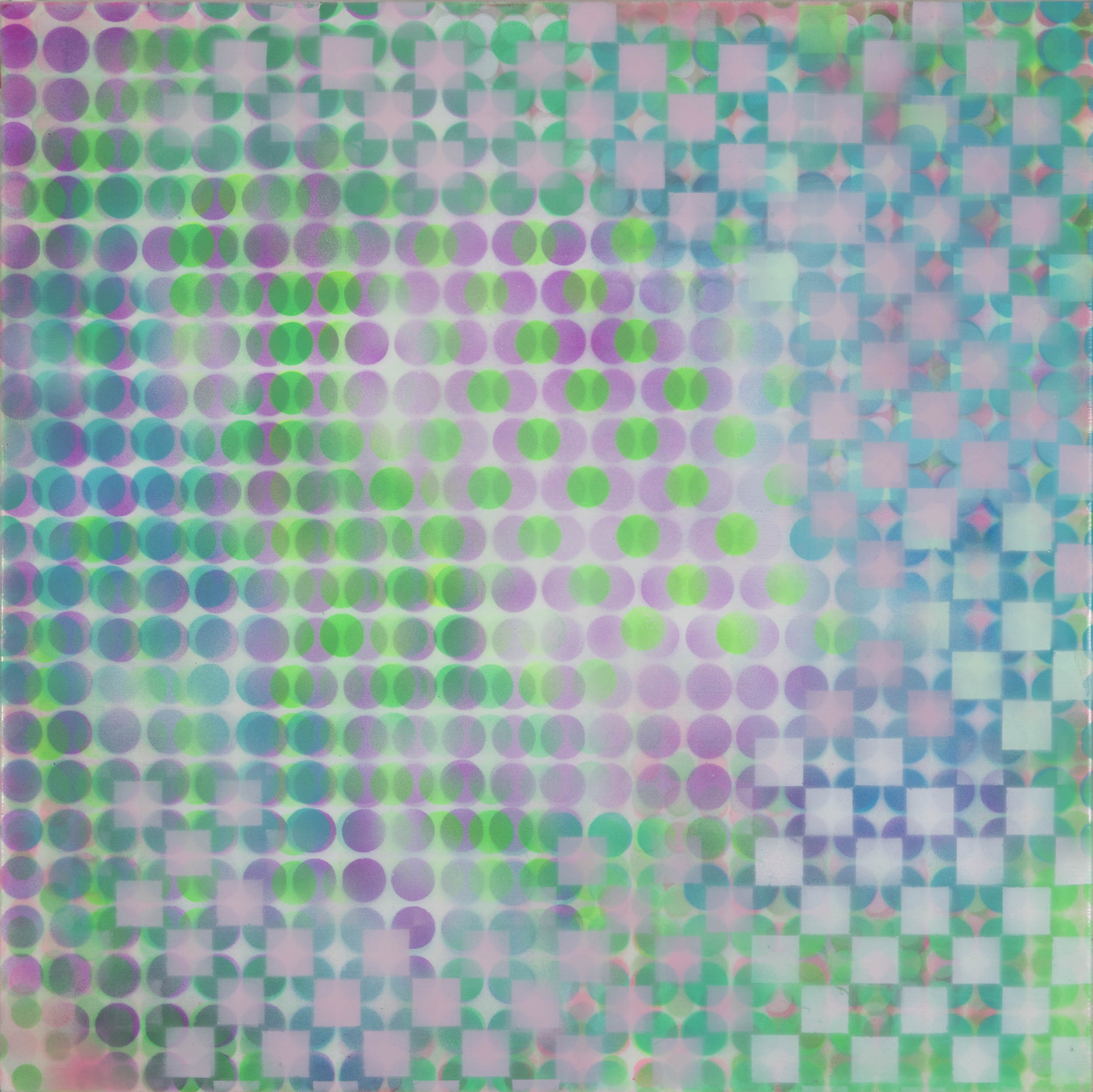 Made by layering clear acrylic over airbrushed patterns, these small, soft-edged, shaped paintings have surfaces with real depth—cracks and imperfections are sealed into the work, leaving visible “scars” that reveal their handmade origins. Blau’s focus on materiality and sculptural presence aligns her with artists like Kelly and Frank Stella.