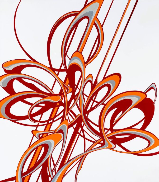 Lisa Stefanelli (American, born 1966) is a painter known for her work in hardline, linear abstraction. Her “Melee” series (1998-2015) is associated with her formative years as a competitive figure skater. Made with automotive paint on panel and drawing on a multitude of visual references, the paintings represent a conversation about the artist’s view of our relationships. They display both grace and complexity in their entanglements, trajectories, and occasional estrangements, and attempt to resolve the struggle that they depict and embody. In the 2010s, Stefanelli began a digital practice centered around concepts from the natural world. This work suggests that all human actions have natural origins.