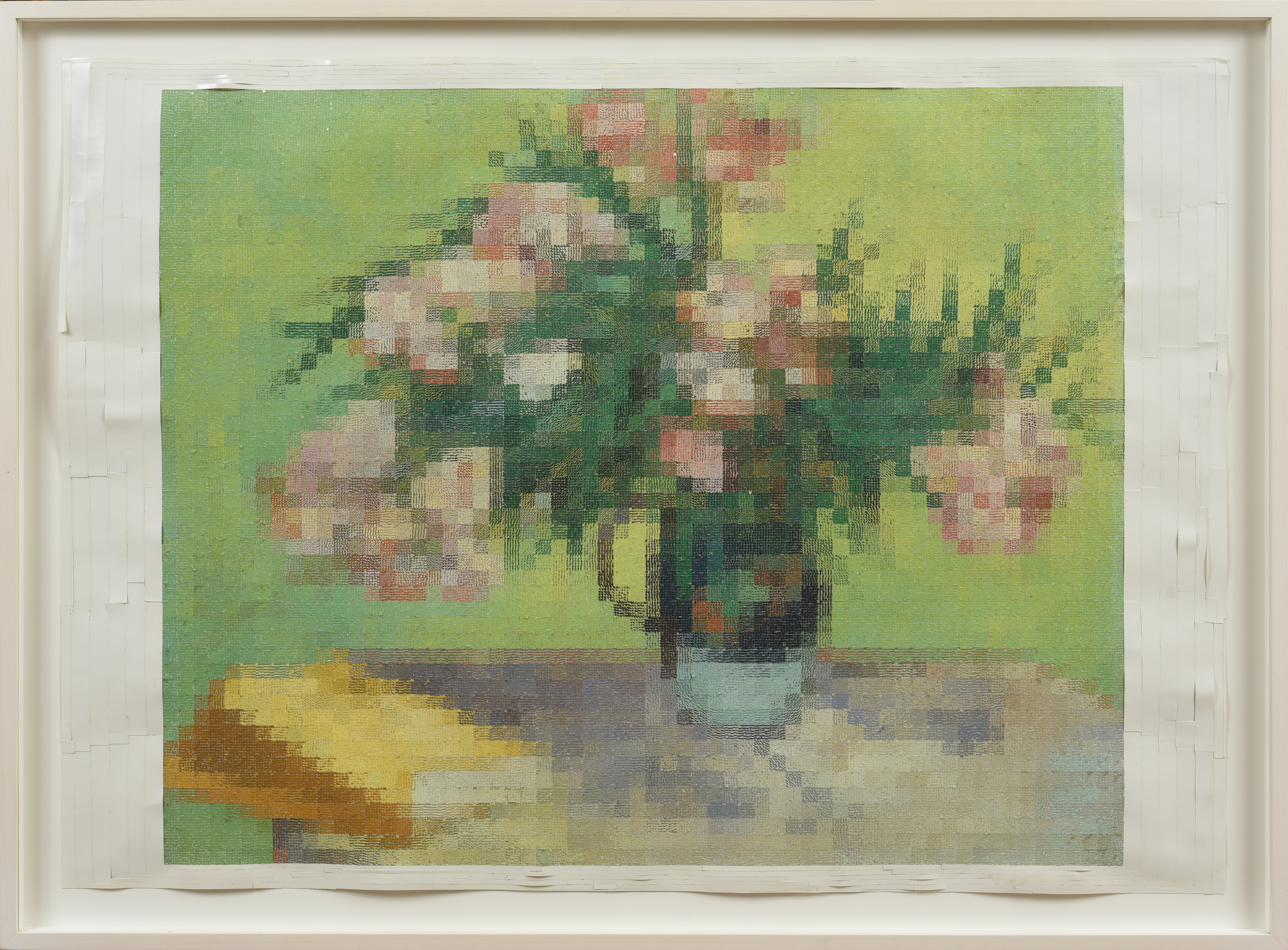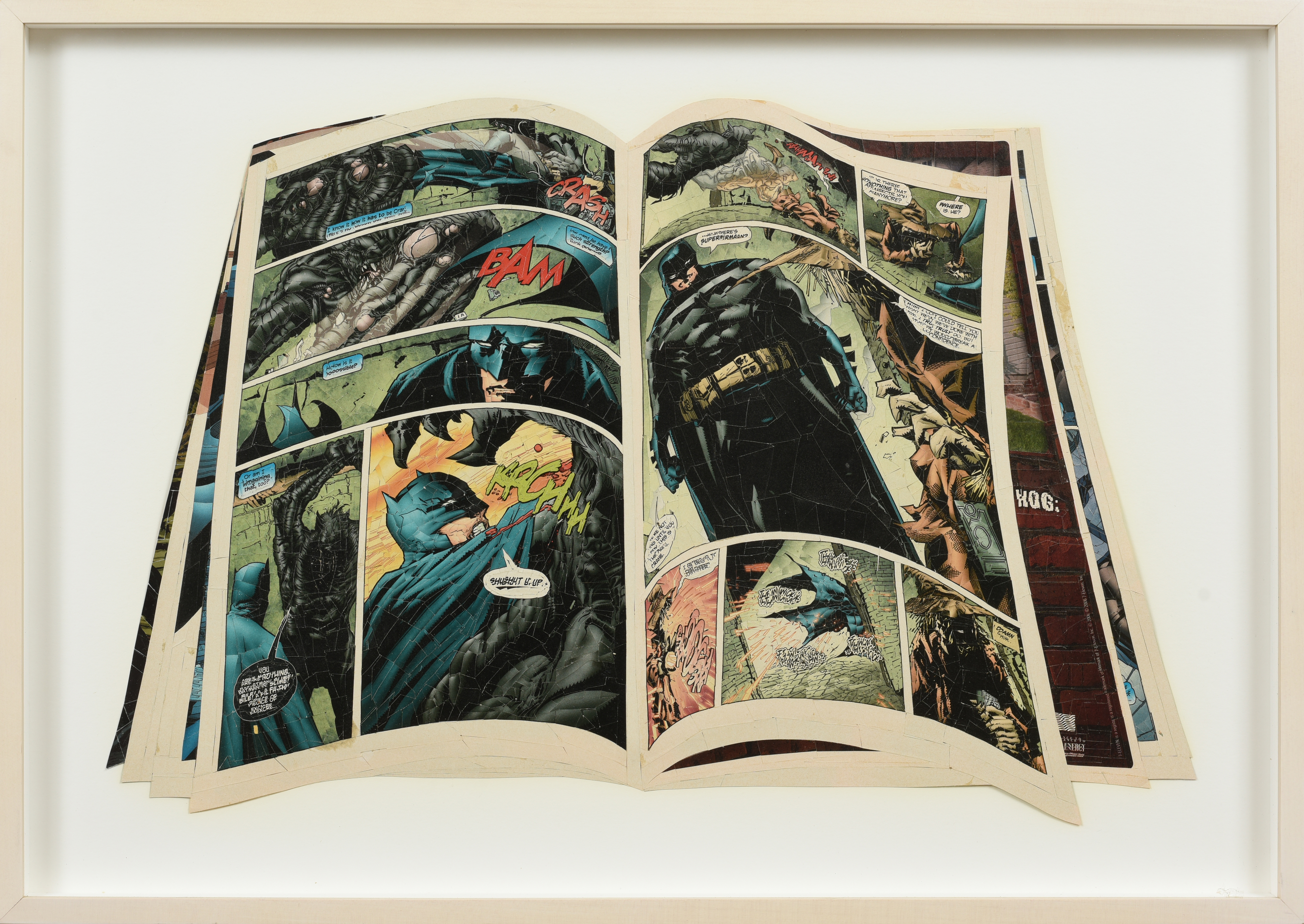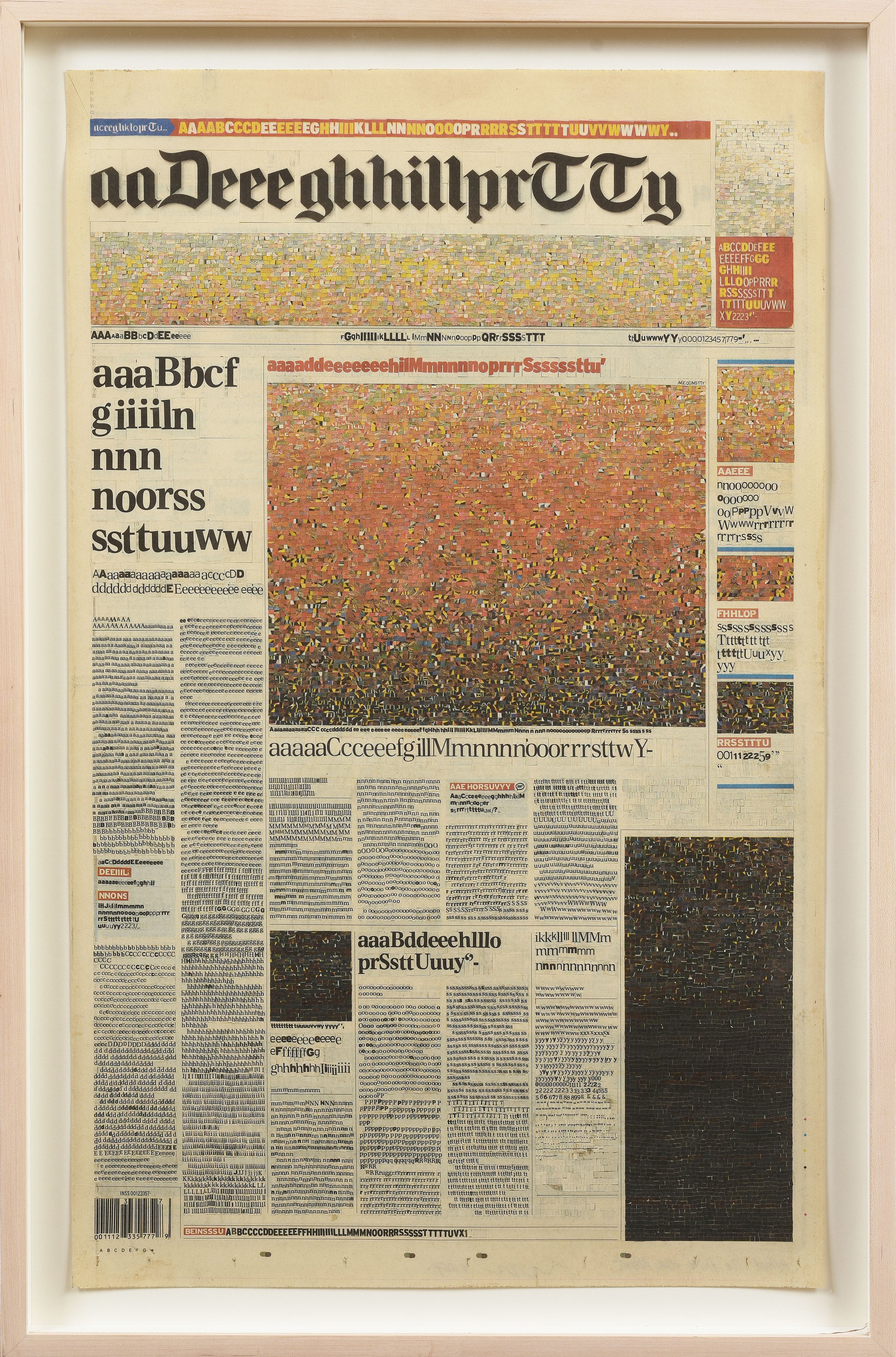 With surgical blades and a meticulous hand, Kim Rugg (b. 1963, Canada) dissects and reassembles newspapers, stamps, comic books, cereal boxes and postage stamps in order to render them conventionally illegible. The front page of the LA Times becomes neatly alphabetized jargon, debunking the illusion of its producers’ authority as much as the message itself. Through her re-appropriation of medium and meaning, she effectively highlights the innately slanted nature of the distribution of information as well as its messengers. Rugg has also created hand-drawn works alongside wallpaper installations, both of which toy with authenticity and falsehood through subtle trompe l’oeil. In her maps, Rugg re-envisions the topography of various states, countries, continents, and even the world without borders, featuring a staggeringly precise hand-drawn layout with only city names and regions as reference points. In own sense of abstracted cartography, Rugg redistributes traditional map colors (or eliminates them entirely) in order to nullify the social preeminence given to constructed territories, and highlight the idea that our attention is manipulated to focus on the powerful few instead of the physical many.