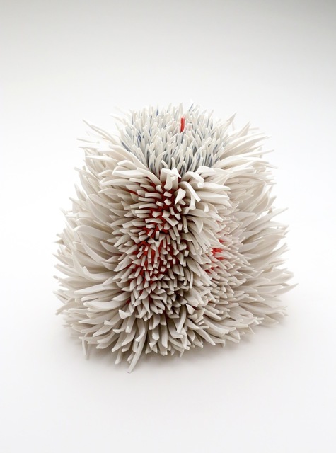 Using white and colored porcelains, Peled transforms sharp slivers of porcelain into feathers, petals, leaves, and spines that describe objects of unknowable origins: seductive but untrustworthy. The forms are complexly ordered from the inside out, often bulging or spilling over with textures both delicate and severe. In some works, large scale-like ceramic pieces appear airy, delicate, and fluffy, as if one’s breath might break it. In others, Peled’s fragments are geometric barbs that mysteriously take on an alluring form – offering a sense of softness despite a sharp actuality. The forms are never static; the visual dance of sharp ceramic parts conveys a sense of constant movement. Like a murmuration of starlings, the sculptures appear to shift shapes as you move around them, an identity becoming and unbecoming in front of you.